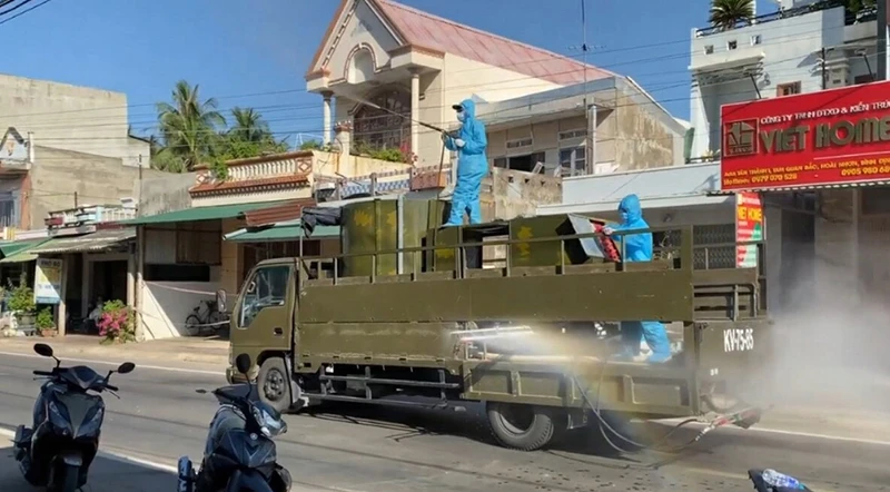 Phun hóa chất khuẩn khử ở đường phố thị xã Hoài Nhơn. Ảnh: LÊ HOÀNG THI