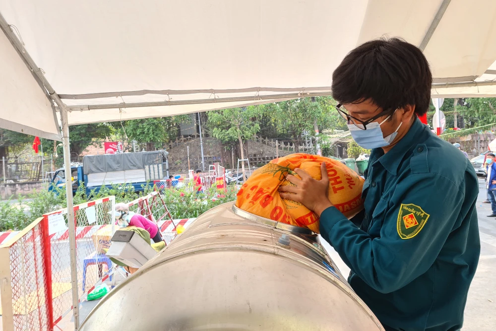 Ngoài hàng rào phong tỏa, hàng tấn gạo được các mạnh thường quân đưa đến để kịp thời hỗ trợ cho người dân.