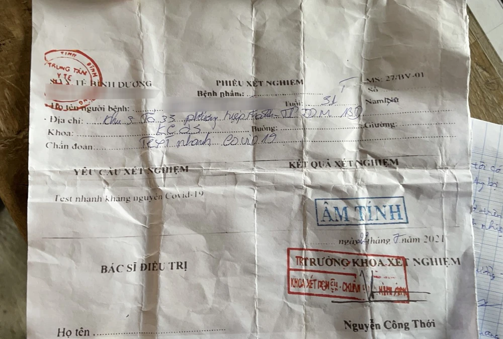 Anh T. khai nhận, ngày 20-7 anh đến một phòng khám nằm trên Đại lộ Bình Dương (phường Hiệp Thành, TP Thủ Dầu Một) để test COVID-19 làm giấy đi đường.