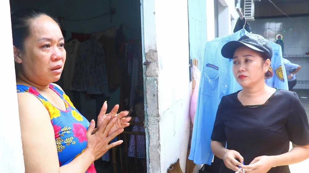 Một người ở trọ bật khóc khi bà Đoàn Thùy Dương (chủ nhà trọ) thông báo miễn hai tháng tiền trọ. Ảnh: LÊ ÁNH