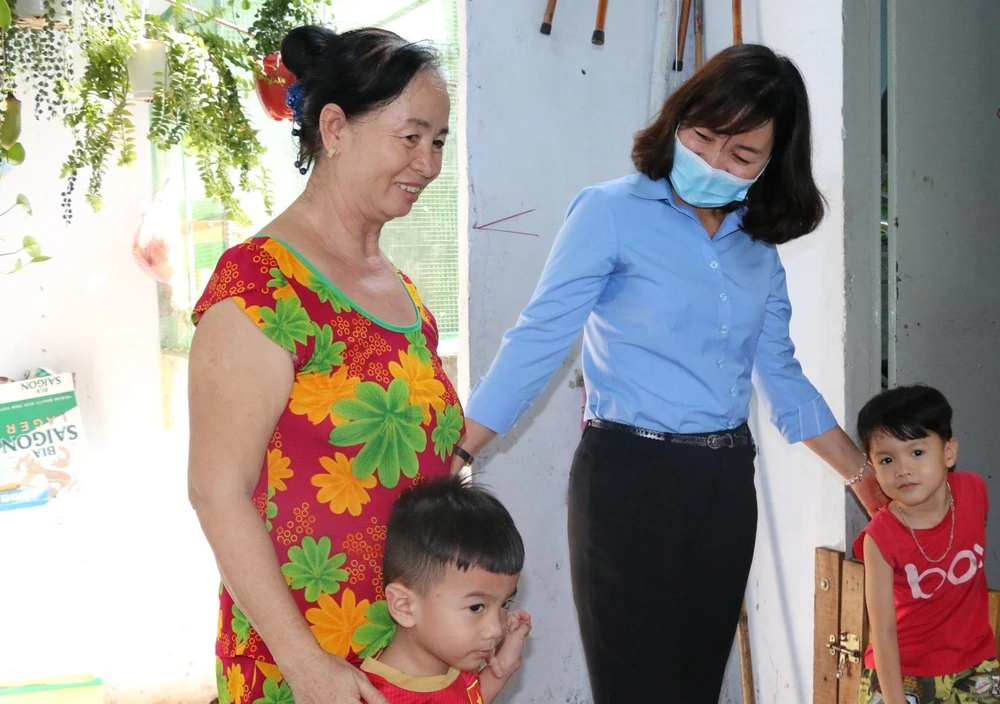 Bà Nguyễn Thu Cúc, Phó Chủ tịch UBND TP Thủ Dầu Một (phải), thăm hỏi, động viên chủ nhà trọ và người lao động tại các khu nhà trọ. Ảnh: LÊ ÁNH