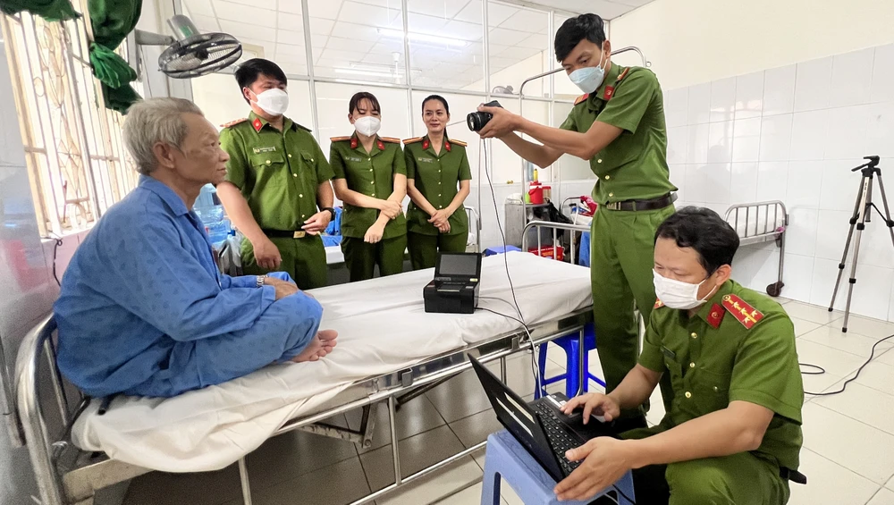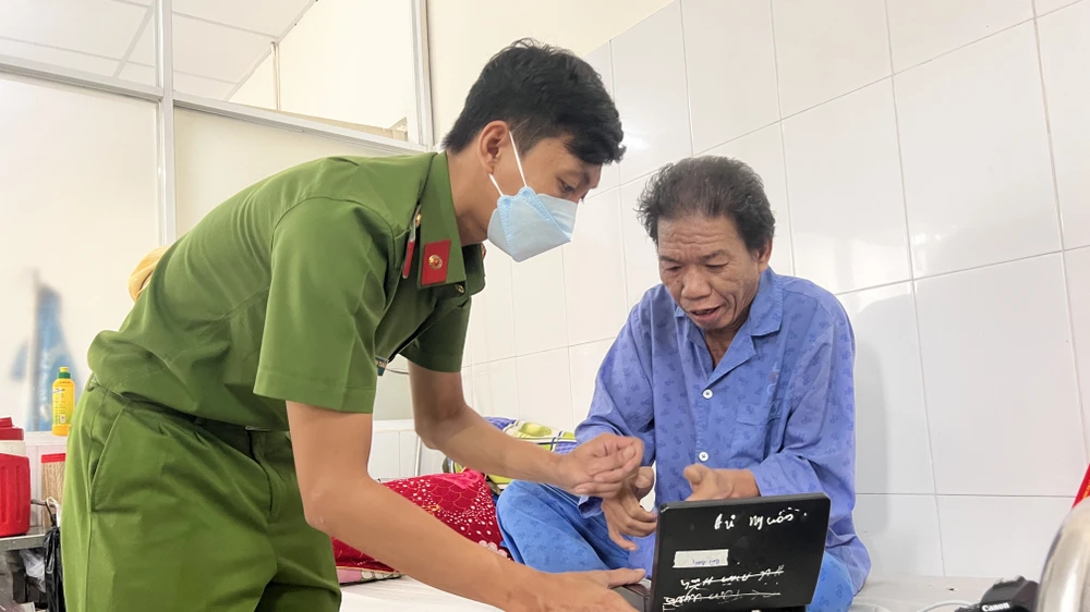 Lực lượng công an kích hoạt tài khoản định danh điện tử và tích hợp thẻ BHYT vào CCCD cho người bệnh. Ảnh: LÊ ÁNH |