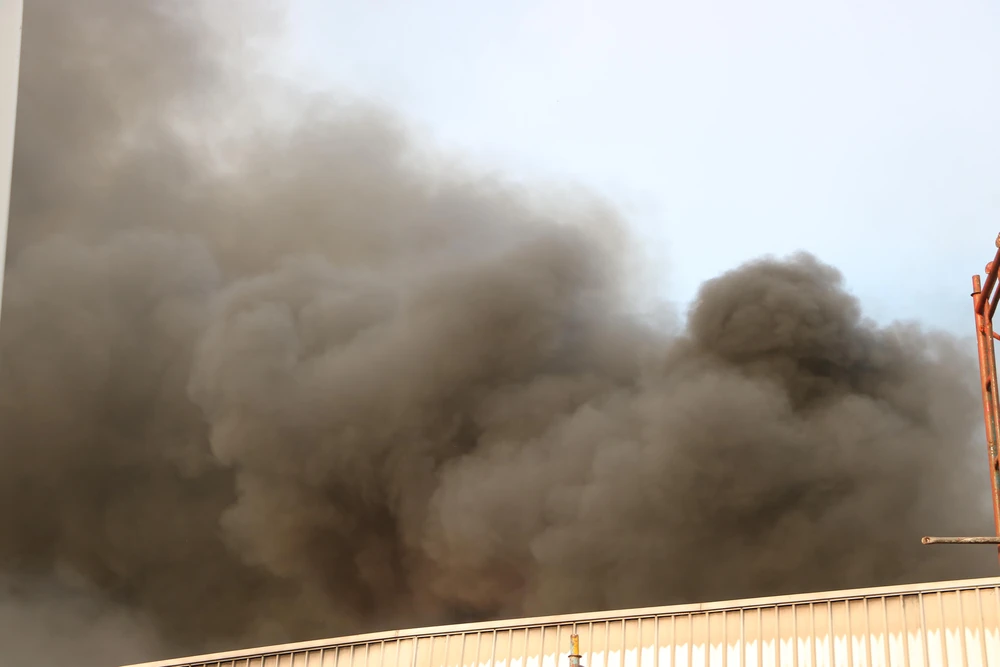 Lửa bao trùm kho thành phẩm của công ty, cột khói bốc cao hàng chục mét.