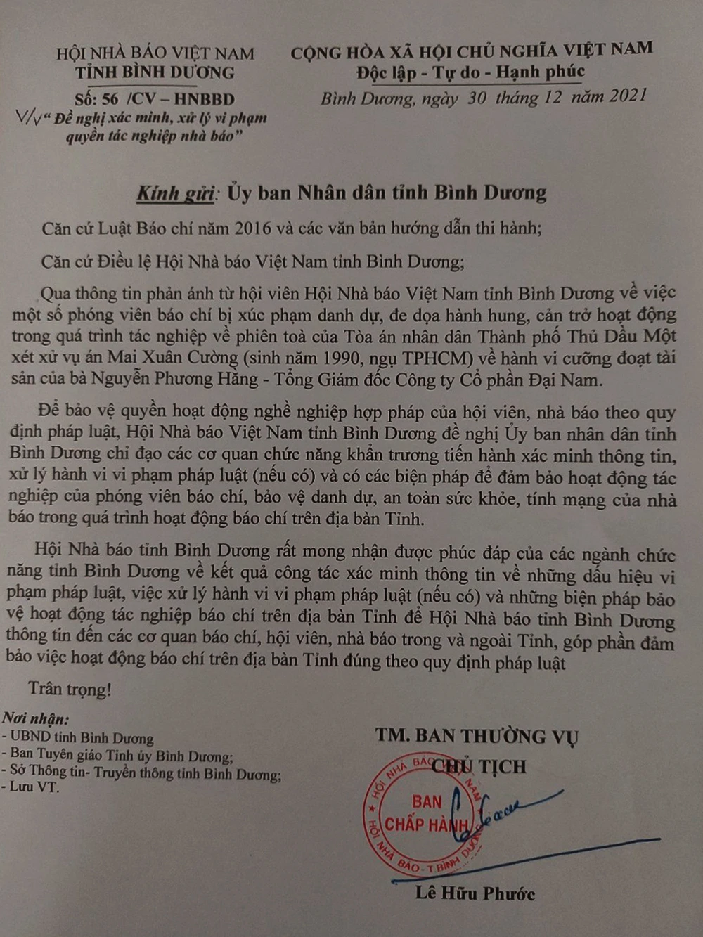 Theo công văn này, Hội Nhà báo nêu rõ việc một số phóng viên, nhà báo bị xúc phạm danh dự, đe dọa hành hung, cản trở hoạt động tác nghiệp trước khu vực cổng của TAND TP Thủ Dầu Một vào chiều 29-12.