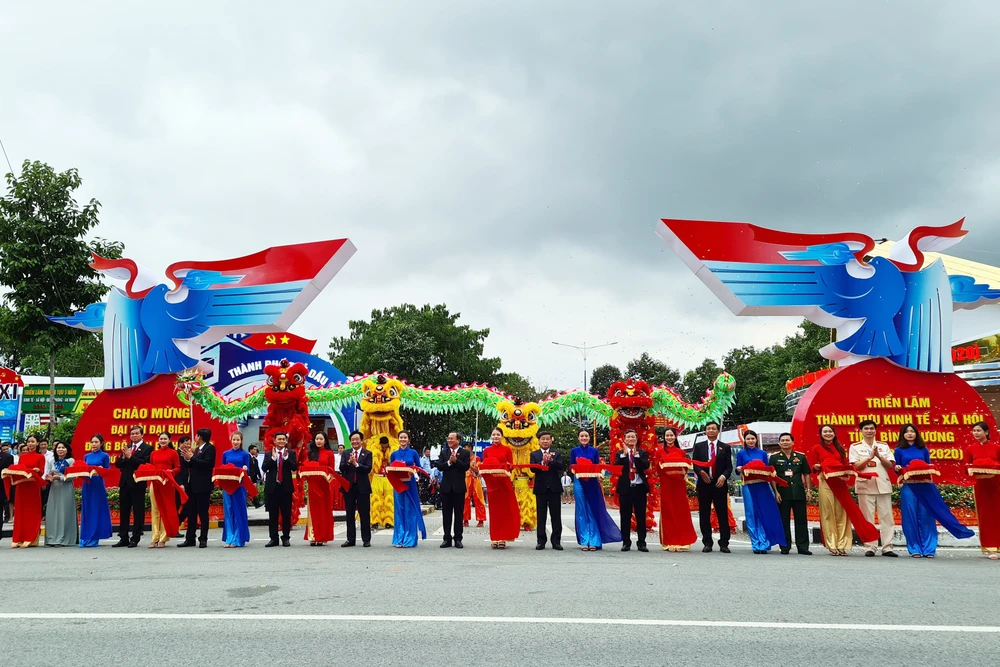 Lãnh đạo tỉnh Bình Dương cắt băng khai mạc triển lãm thành tựu kinh tế-xã hội, quốc phòng-an ninh gia đoạn 2015-2020. Ảnh: LÊ ÁNH