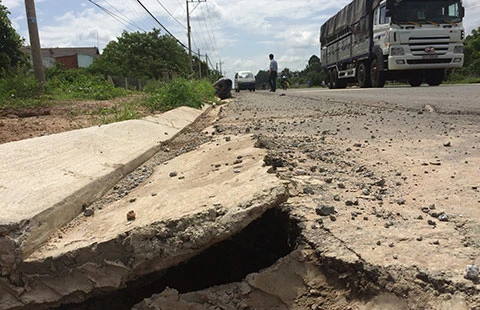 “Không biết họ thi công thế nào mà mặt đường bị nứt toác, những miệng cống gom nước sụt lún tạo thành hố sâu nguy hiểm. Đã có nhiều vụ tai nạn xảy ra ở đoạn đường này” - ông Hoàng Chí Tâm, ngụ bên đường ĐT741, bức xúc.