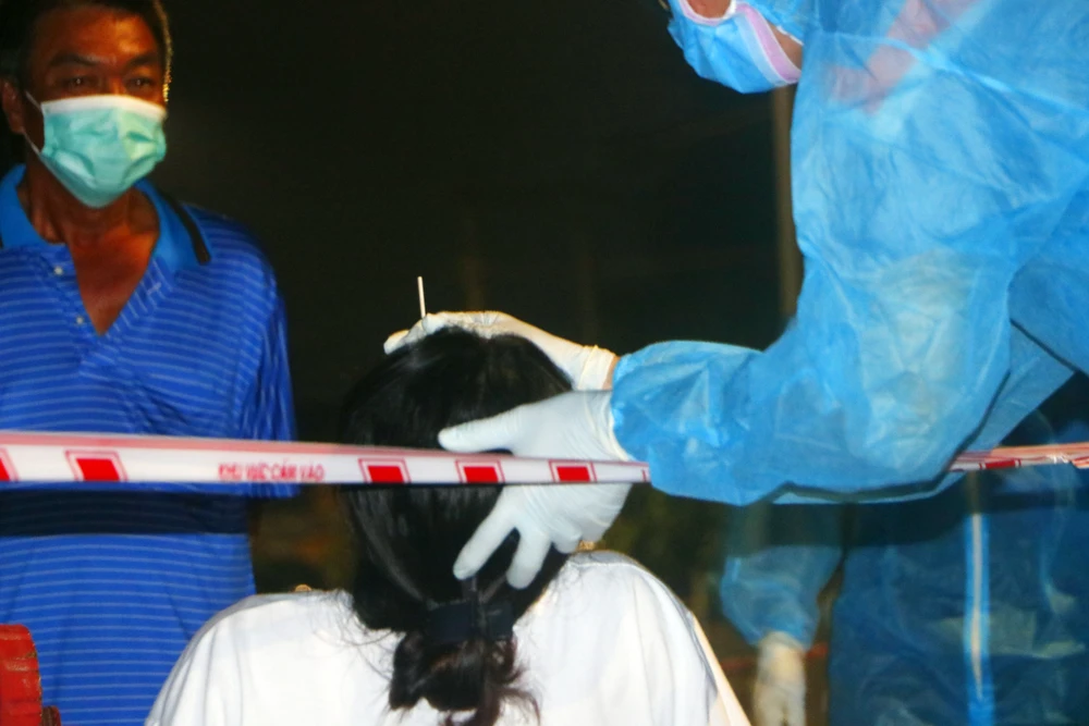 Cán bộ y tế lấy mẫu xét nghiệm COVID-19 cho khoảng 40 ngàn người dân trong đêm 24-6. Ảnh: LÊ ÁNH