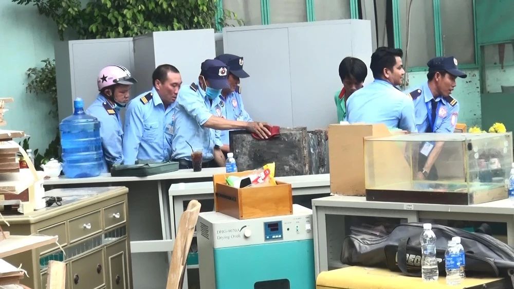 Nhân viên công ty đưa két sắt ra khỏi khu vực đang cháy