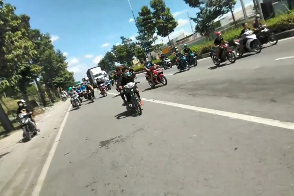 Theo clip người dân ghi lại, trưa cùng ngày bất chấp nguy hiểm đến tính mạng, hàng trăm thanh niên điều khiển xe máy, dàn hàng ngang trên đường Mỹ Phước-Tân Vạn, nẹt bô, bốc đầu, so kè tốc độ khiến các phương tiện không thể lưu thông qua đây.