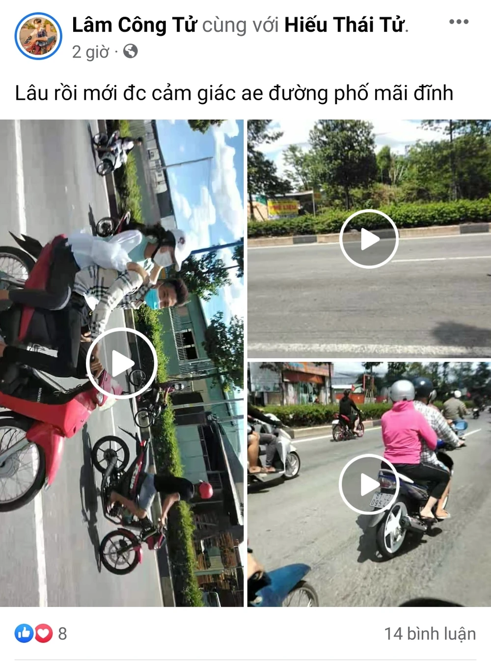 Đáng chú ý, chủ một tài khoản facebook còn quay lại clip đăng trên trang cá nhân để khoe chiến tích: “lâu rồi mới đc cảm giác ae đường phố mãi đỉnh”. Và cũng chính tài khoản facebook này trước đó cũng đăng trên trang cá nhân của mình lời kêu gọi: “chuẩn bị bay 1h nha”.