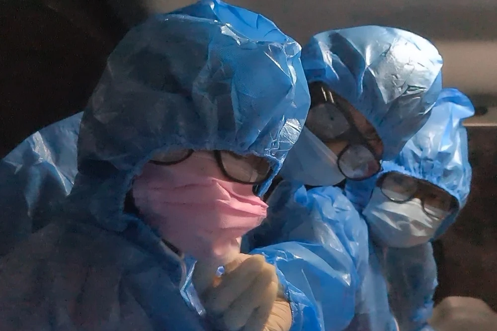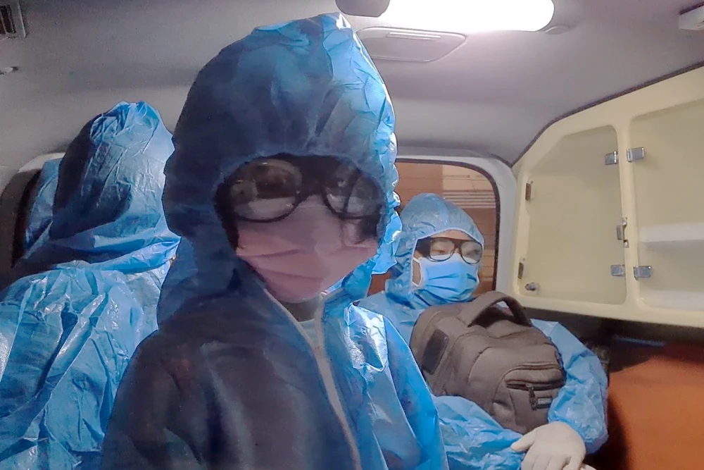Trên xe sáu người mặc đồ bảo hộ kín mít, không còn có thể nhận ra ai là nam, ai là nữ. Chỉ một lúc lên xe bé gái đã khóc và liên tục đòi xuống xe, về nhà vì nóng: “Ông ơi, nóng quá…, cởi đồ này ra đi, cháu muốn về nhà”. Hai ông bà ngoại của bé liên tục dỗ dành, bảo bé ráng đợi một xíu nữa là đến nơi rồi.