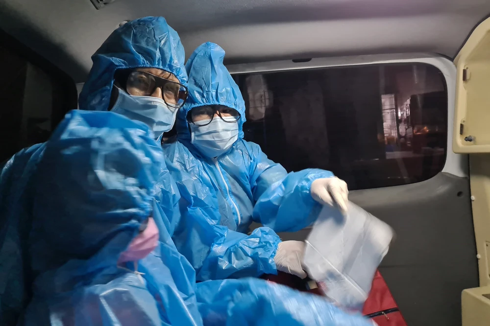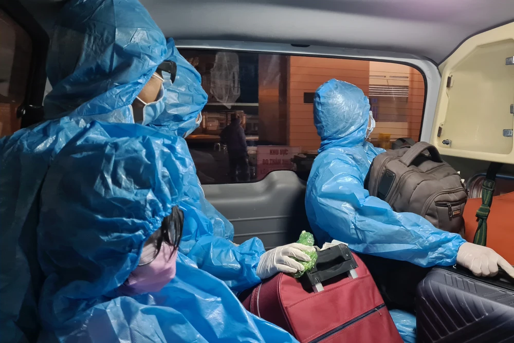 Tiếp đó, chiếc xe cấp cứu tiếp tục di chuyển đến Trung tâm y tế phường Phú Mỹ để tiếp nhận thêm 3 trường hợp F1 khác đi cách ly tập trung. Ba trường hợp này là hai ông bà và một bé gái 5 tuổi.
