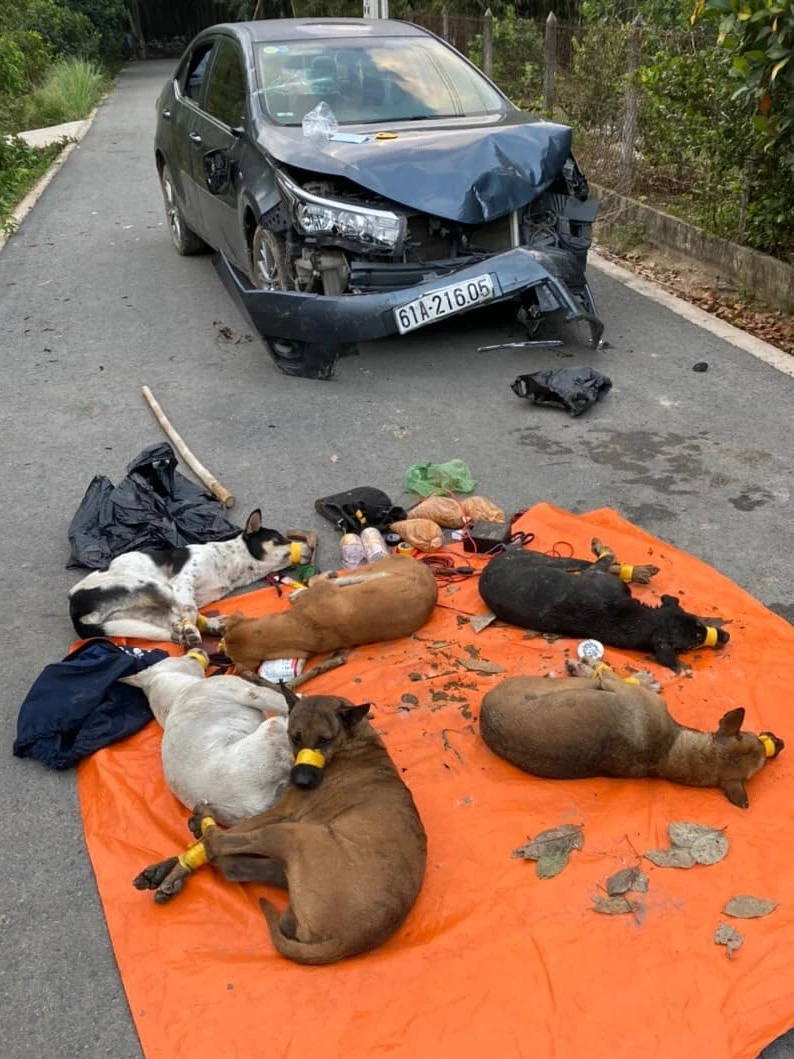 Tại hiện trường, cơ quan công an phát hiện trên chiếc xe này có bảy con chó bị trói chân, dùng băng keo quấn quanh miệng. Nhiều súng bắn điện, bột ớt, một nón kepi của ngành công an và các dụng cụ dùng để trộm chó cũng được tìm thấy.