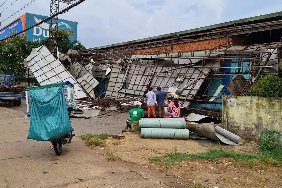 Một cơ sở kinh doanh nằm trên Đại lộ Bình Dương (TP Thủ Dầu Một) bị sập phần mái trước do mưa lớn. Ảnh: LÊ ÁNH