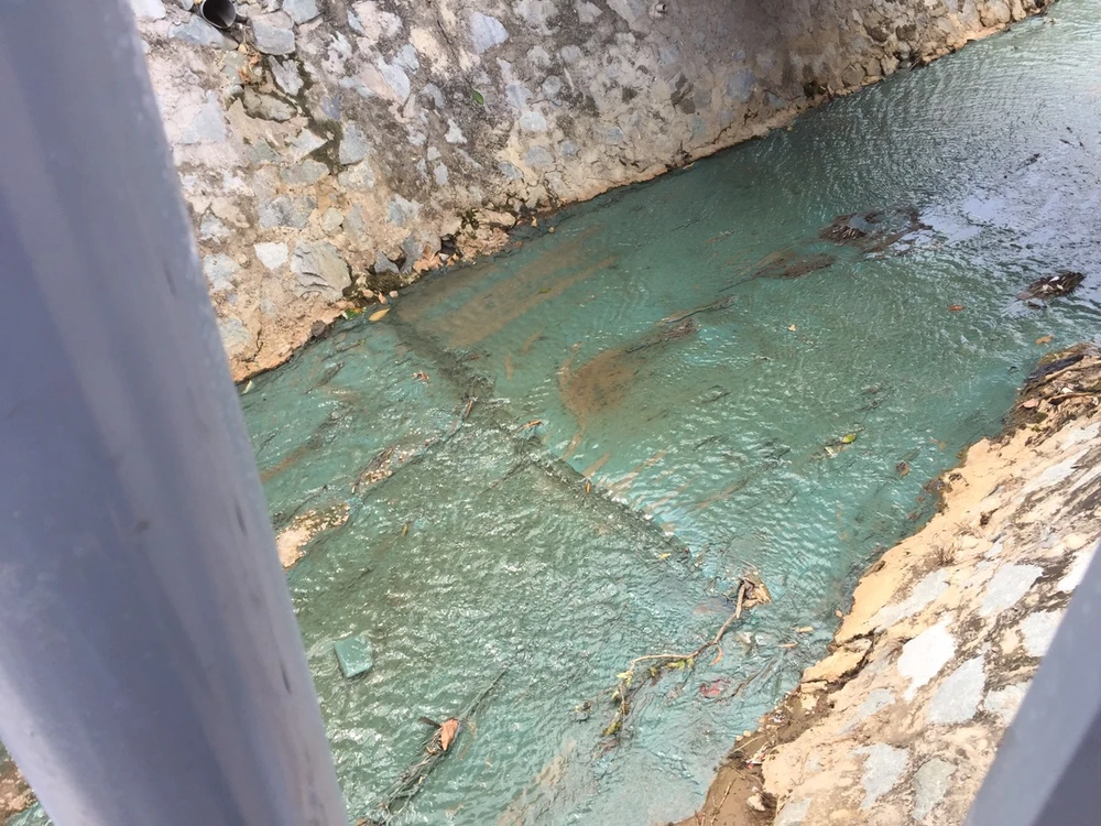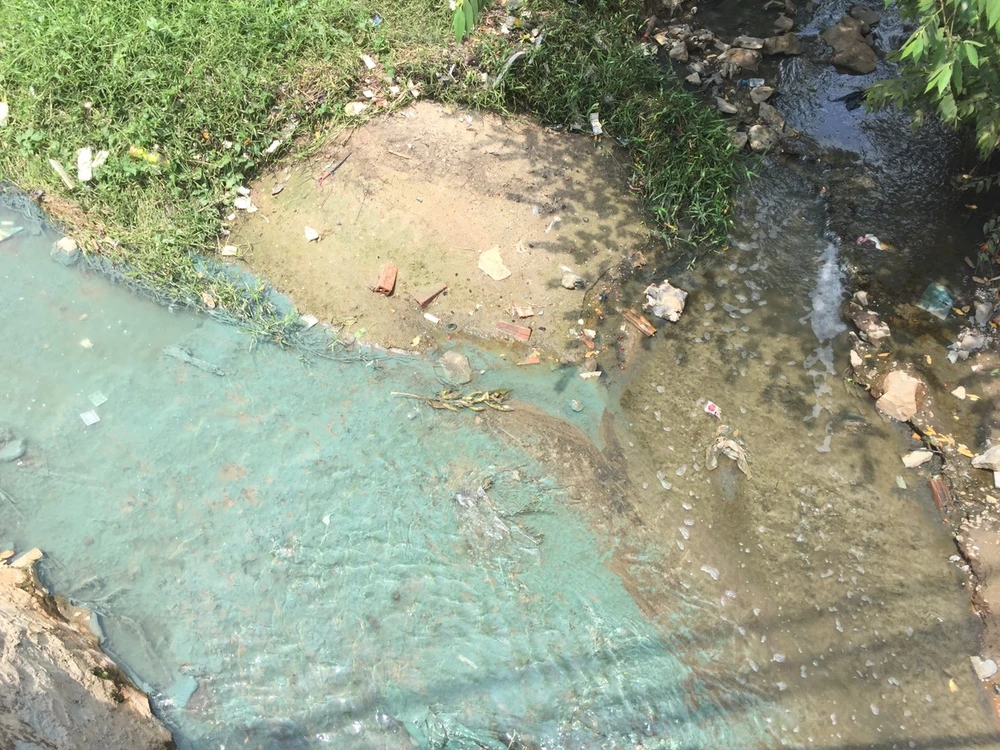 Nhiều nguồn thải đổ vào suối Cây Sao nhưng chỉ có một nguồn có màu xanh. Ảnh: LÊ ÁNH