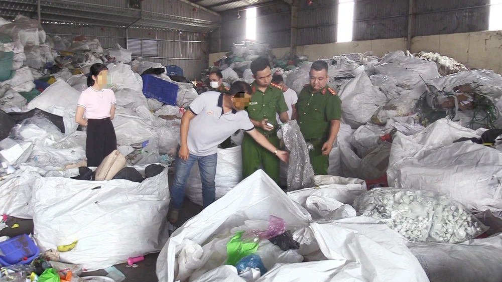 Tại thời điểm kiểm tra, cơ quan công an phát hiện một nhà kho diện tích gần 2.000m2có chứa khoảng 40-50 tấn chất thải công nghiệp thông thường gồm giấy vụn, bao bì nhựa, nhựa phế, mút xốp, kim loại thải...