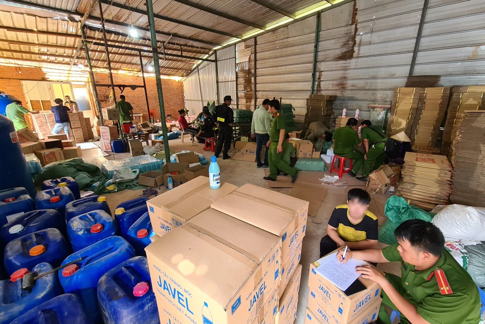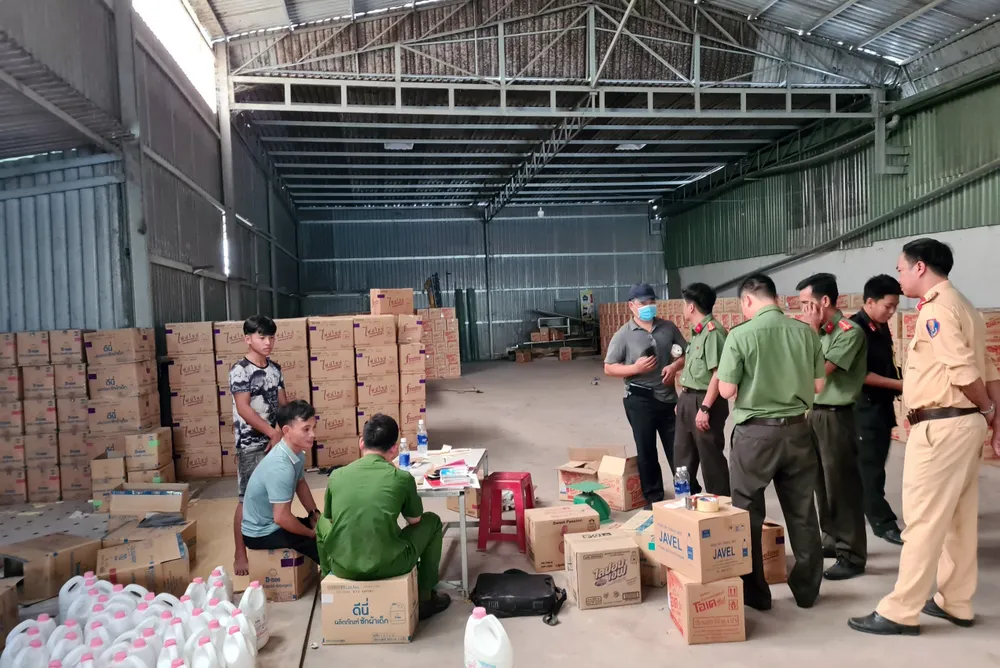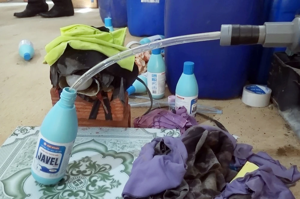 Bước đầu, chủ cơ sở này khai nhận, đã pha các loại hóa chất giống các sản phẩm dung dịch tẩy rửa vệ sinh có thương hiệu lớn đổ vào bồn hàng ngàn lít. Sau đó, dùng ống dẫn chiết sang các chai nhựa rồi dán nhãn, tem, đóng thùng tuồn ra thị trường.