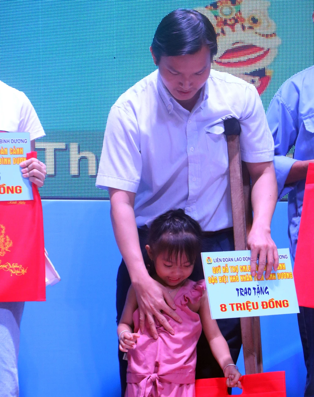 Anh Võ Trung Tính, là công nhân đang làm việc tại Công ty TNHH Việt Nam Onamba (KCN Vsip 2, Bình Dương), với đôi nạng phải rất khó khăn để lên sân khấu nhận quà và vé xe về quê ăn tết cho biết: Anh quê ở Đồng Tháp đã lên Bình Dương làm việc được 10 năm. Mới hơn một năm nay anh bị tai nạn lao động cuộc sống của anh và gia đình gặp phải rất nhiều khó khăn.
