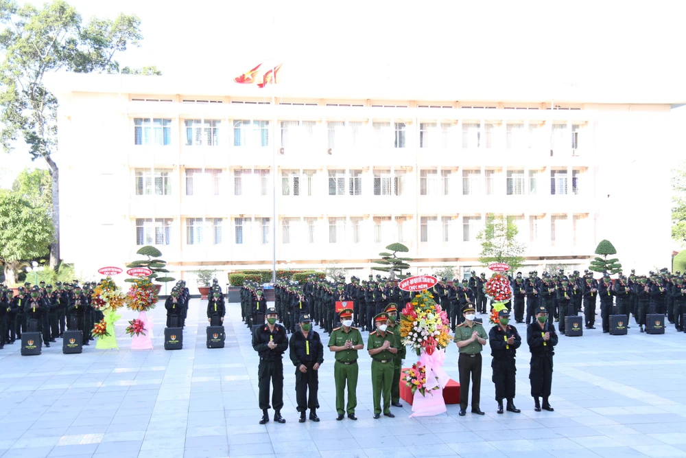 Lãnh đạo Công an tỉnh Bình Dương tặng hoa chúc mừng Ban Chỉ huy Tiểu đoàn Cảnh sát cơ động dự bị chiến đấu. Ảnh: LÊ ÁNH