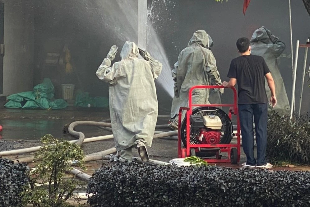 Bên ngoài cơ sở sản xuất nước đá, nhiều phương tiện PCCC và hàng chục cán bộ chiến sĩ đã tiến hành phun nước để ngăn ngừa nguy cơ phát cháy. Lực lượng chức năng phải mặc đồ bảo hộ rồi mới vào khu vực cơ sở sản xuất nước đá để xử lý vụ việc.