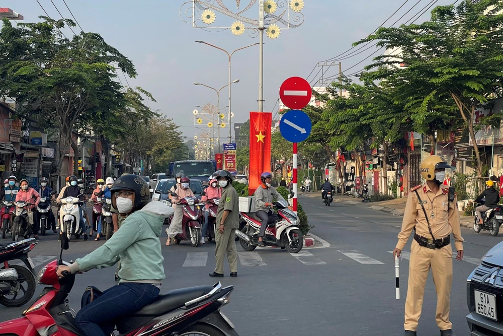 Lực lượng công an phong tỏa, điều tiết giao thông quanh khu vực có khí rò rỉ. Ảnh: LA