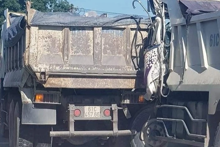 Cú tông mạnh khiến đầu xe ben 61C-225.04 bẹp dúm, tài xế bị mắc kẹt trong cabin kêu cứu thảm thiết.