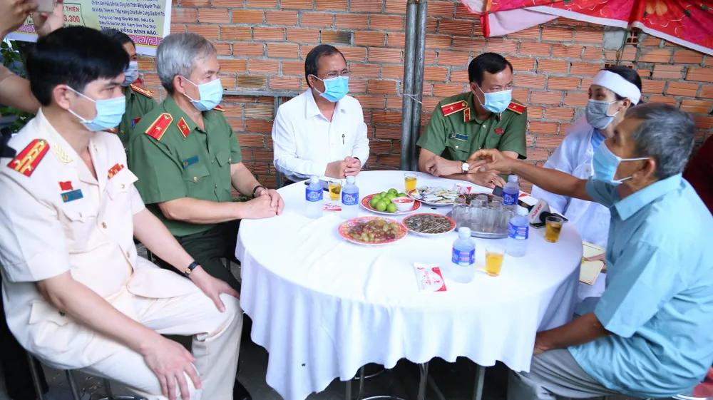 Thiếu tướng Lê Tấn Tới cùng lãnh đạo tỉnh Bình Dương đến thăm chia buồn cũng gia đình Đại úy Lê Thanh Hải. Ảnh: LÊ ÁNH