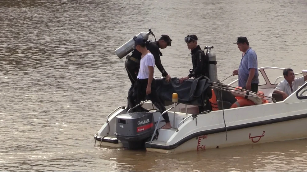 Lực lượng người nhái tiến hành trục vớt chiếc ghe hút cát lậu bị đánh chìm. Ảnh: LÊ ÁNH
