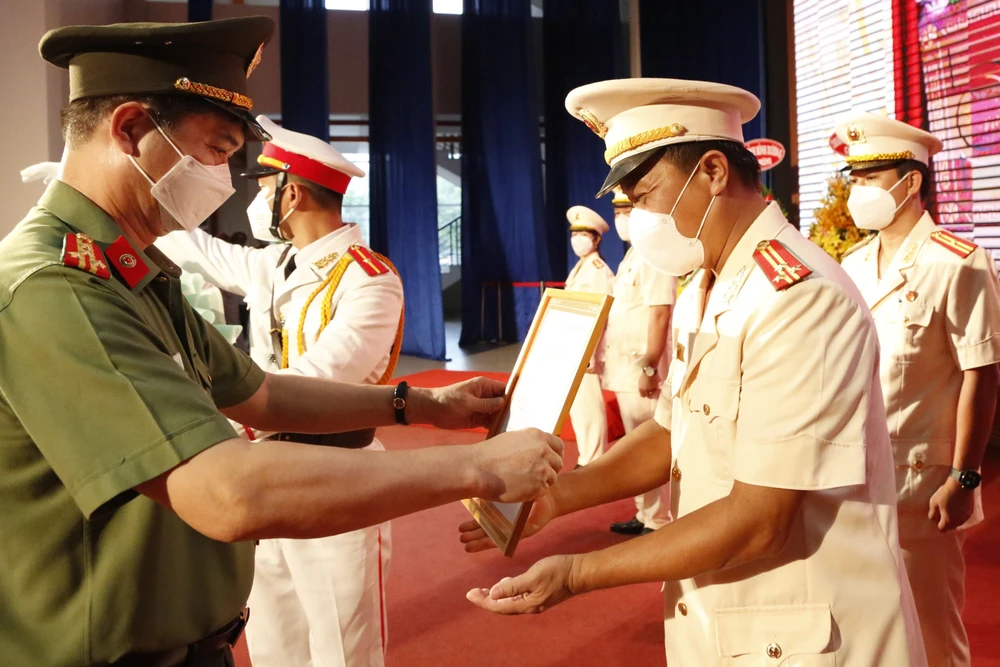 Đại tá Trịnh Ngọc Quyên-Giám đốc Công an tỉnh Bình Dương (trái) trao quyết định cho lãnh đạo đơn vị mới. Ảnh: CACC