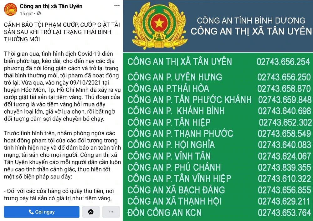 Trang thông tin trên mạng xã hội của công an thị xã Tân Uyên cảnh báo người dân về nạn trộm cướp. Tại đây cũng niêm yết số điện thoại của công an các địa phương để người dân liên hệ. Ảnh: CACC