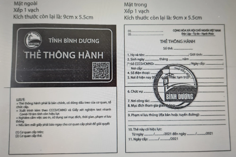 Ngày 3-9, ông Võ Văn Minh, Chủ tịch UBND tỉnh Bình Dương cho biết tỉnh này sẽ cấp giấy thông hành cho một số lực lượng được phép ra đường theo mẫu của cơ quan chức năng.