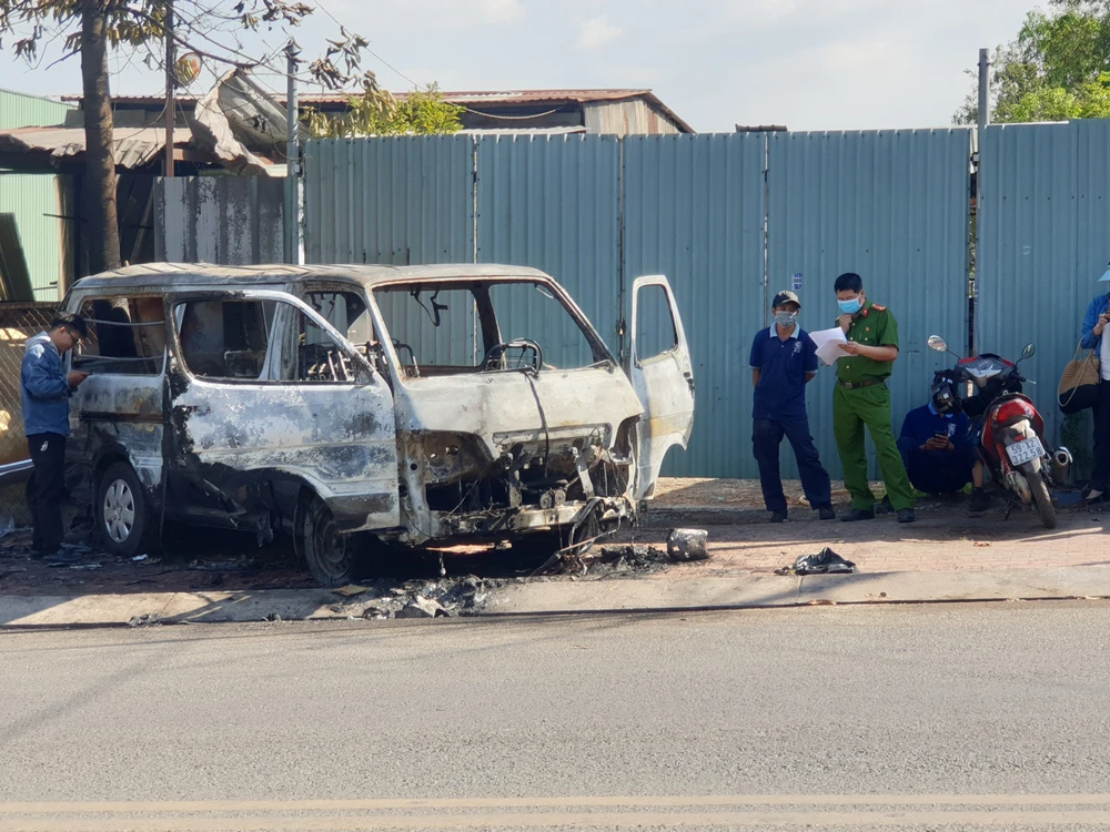 Chiều 18-2, Công an TP Dĩ An (Bình Dương) đang khám nghiệm hiện trường điều tra nguyên nhân vụ một ô tô bị cháy khi đang chạy trên đường.