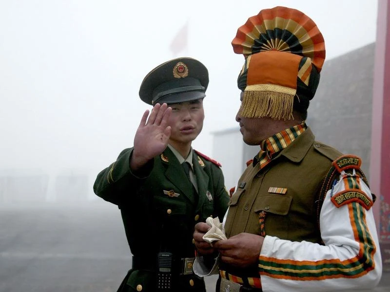 Một binh lính Trung Quốc (trái) ra hiệu với binh lính Ấn Độ tại biên giới Nathu La, bang Sikkim, phía Đông Bắc Ấn Độ. Ảnh: AFP