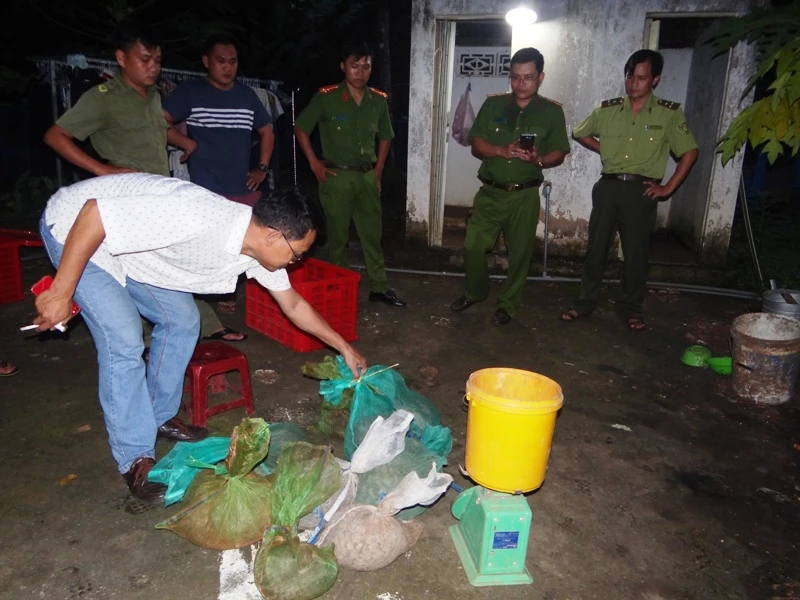 Kiểm tra một ngôi nhà đối diện nhà ông Hạnh, đoàn công tác còn phát hiện trong nhà kho có 11 con tê tê. Tổng cộng có khoảng 40-50 con khỉ đuôi dài, 16 con rắn hổ mang chúa, 11 con tê tê và hàng chục con kỳ đà hoa là động vật hoang dã quý hiếm. Theo ghi nhận tại hiện trường, các động vật trên phần lớn đang được chứa trong bao, có dấu hiệu chuẩn bị bán ra thị trường.