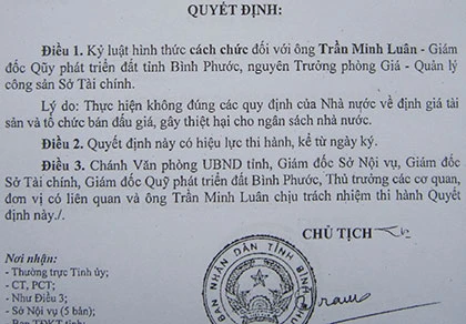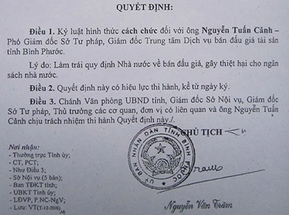 Theo đó, ông Trương Văn Phẩm - phó giám đốc Sở Tài chính bị kỷ luật với hình thức cách chức. Ông Nguyễn Tuấn Cảnh, phó giám đốc Sở Tư pháp kiêm giám đốc Trung tâm Dịch vụ bán đấu giá tài sản tỉnh, bị kỷ luật cách chức. Ông Trần Minh Luân, giám đốc Quỹ Phát triển đất tỉnh, nguyên trưởng phòng Giá - Quản lý công sản (Sở Tài chính), cũng bị kỷ luật với hình thức cách chức. Trước đó, Ban Thường vụ Tỉnh ủy Bình Phước cũng đã cảnh cáo về mặt Đảng với cả ba ông.
