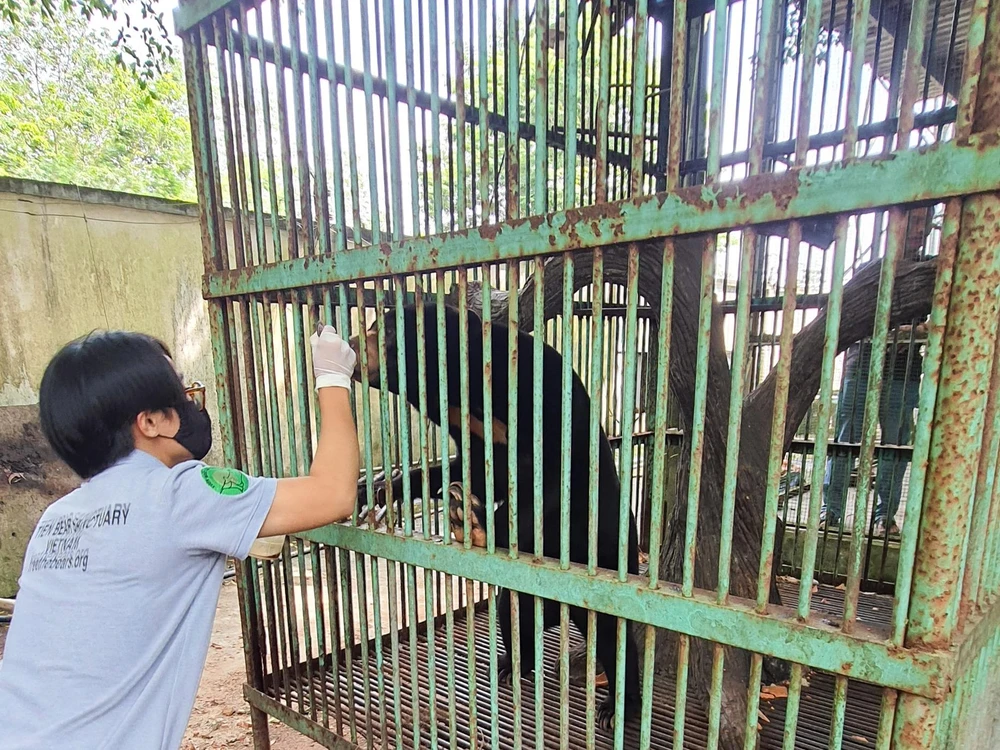 Theo kiểm tra ngoại quan, chú gấu nặng hơn 40kg, có sức khỏe và tinh thần tốt, có một vết thương ở chân trước phải do móng quặp vào thịt vì bị nuôi nhốt toàn thời gian trong chuồng trại sắt lâu ngày.