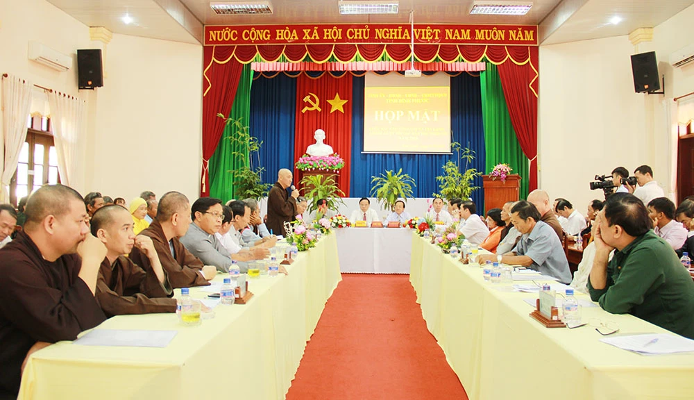 Toàn cảnh buổi họp mặt chức sắc các tôn giáo và già làng, người uy tín trong vùng đồng bào dân tộc thiểu số năm 2018 của tỉnh Bình Phước. Ảnh: XUÂN HÀ