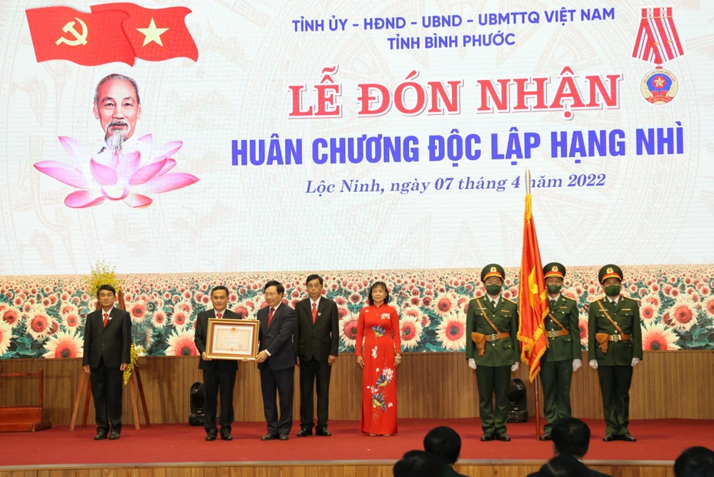 Phó Thủ tướng Thường trực Chính phủ Phạm Bình Minh trao tặng Huân chương Độc lập hạng Nhì cho Đảng bộ, chính quyền và nhân dân huyện Lộc Ninh. Ảnh: BP