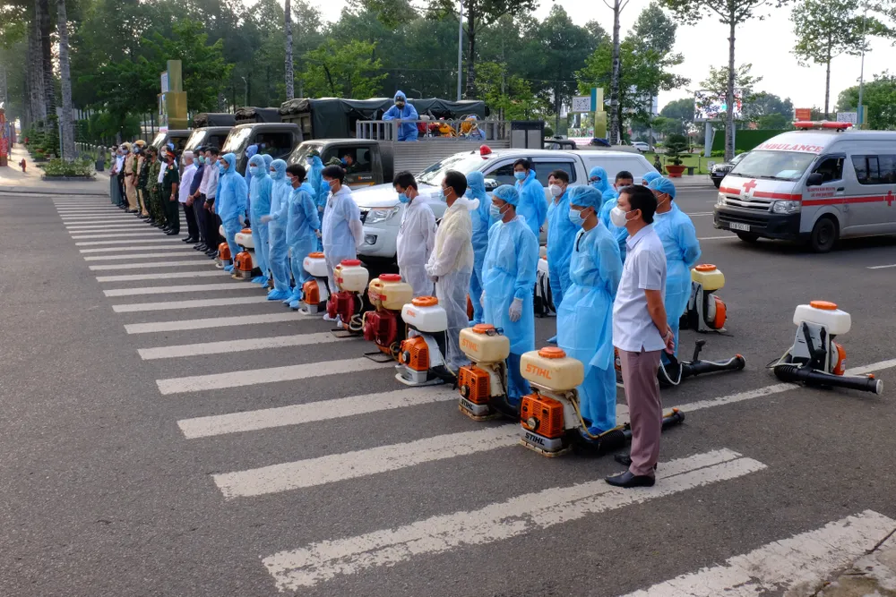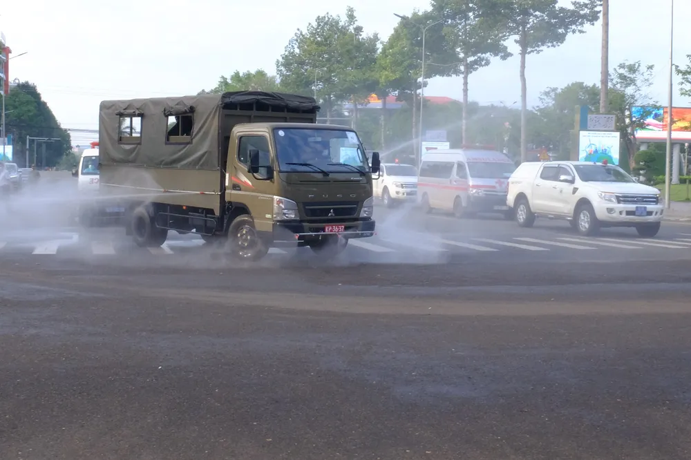 Thực hiện phun khử khuẩn trên diện trộng lần này có sự tham gia của 5 xe phun khử khuẩn của Bộ chỉ huy Quân sự tỉnh Bình Phước, cùng 36 nhân viên y tế.
