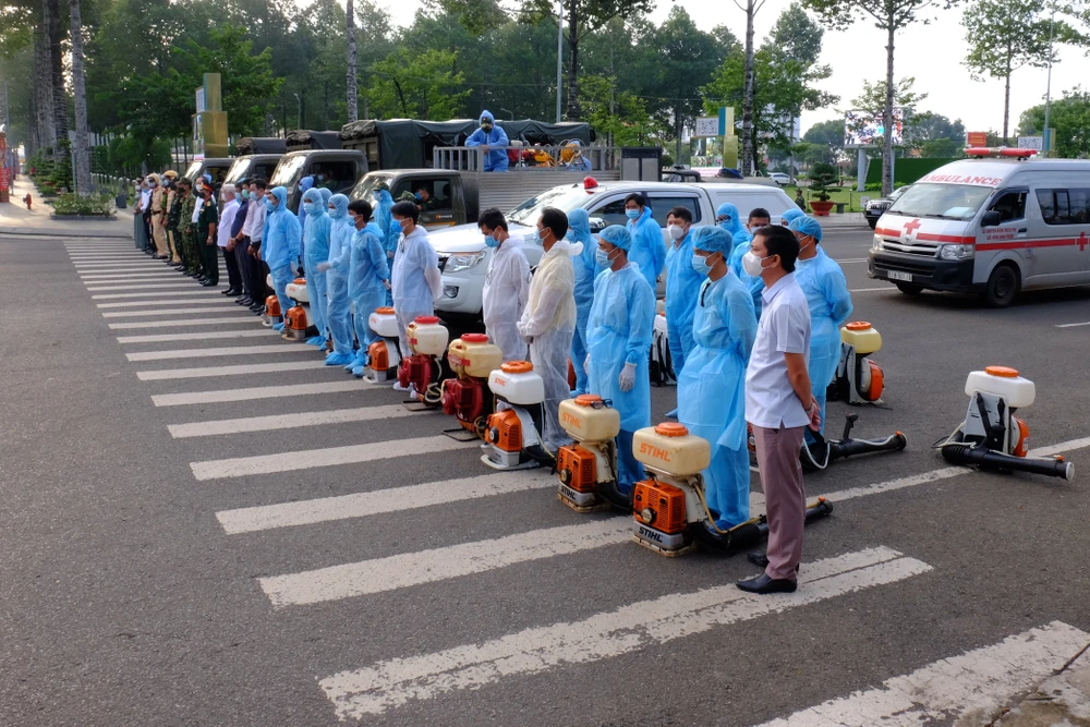 Đội ngũ cán bộ, nhân viên y tế cùng các phương tiện cần thiết tiến hàng phun khử khuẩn. Ảnh: NS