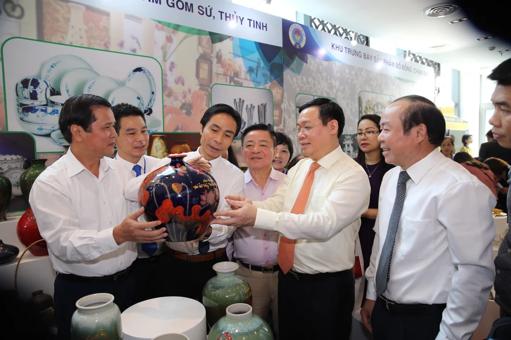 Phó Thủ tướng Vương Đình Huệ cùng các đại biểu tham quan khu vực trưng bày sản phẩm gốm sứ. Ảnh: THÀNH CHUNG
