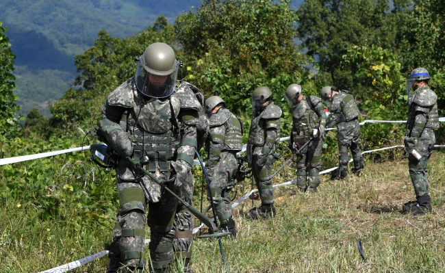 Binh sĩ Hàn Quốc rà mìn ở Khu phi quân sự (DMZ). Ảnh: YONHAP