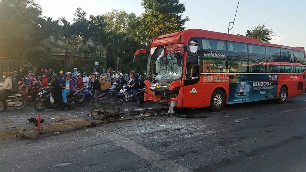 Cú đâm cực mạnh đẩy xe khách 29 chỗ lao đi một đoạn hơn chục mét.