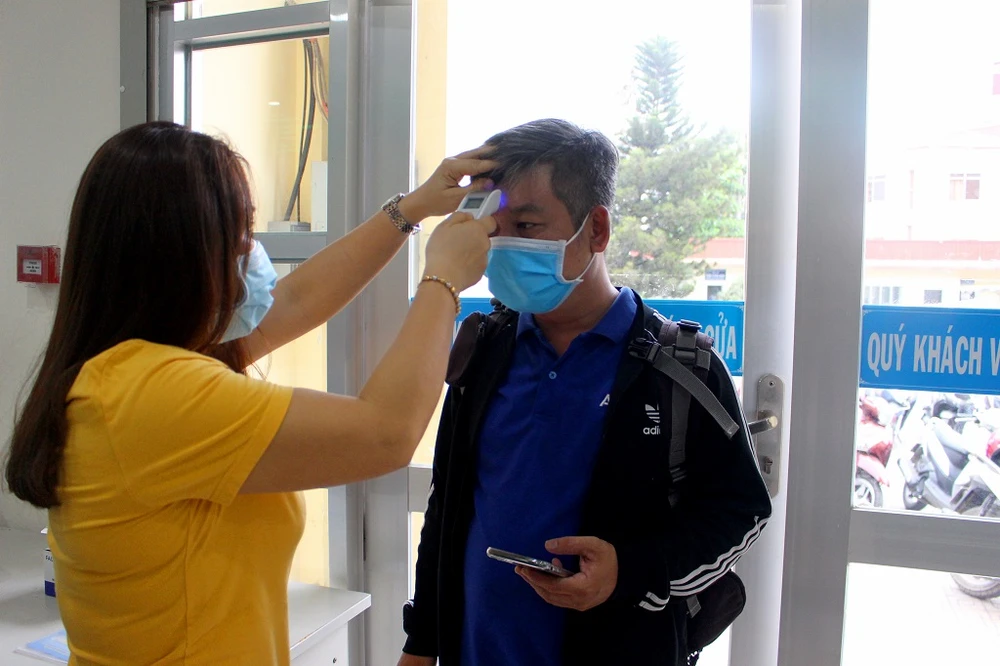 UBND quận Bình Tân đo nhiệt độ người dân khi vào làm thủ tục. Ảnh: L.THOA