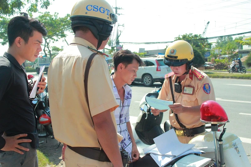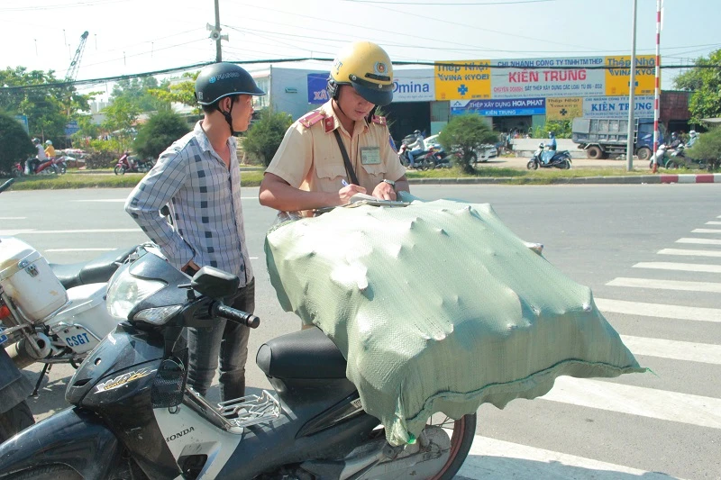 Sáng 25-5, Trạm CSGT Đa Phước đã xử lý nhiều trường hợp xe máy vi phạm giao thông, là nguyên nhân chính dẫn đến TNGT cho khu vực quốc lộ 50. Ảnh: L. THOA