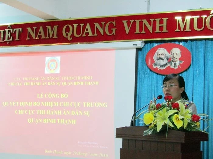 Chiều 29-7, tại Chi cục THADS quận Bình Thạnh, TP.HCM đã diễn ra lễ công bố quyết định của Tổng cục THADS (Bộ Tư pháp) về việc bổ nhiệm bà Trần Thị Hằng, Phó Chi cục trưởng giữ chức vụ Chi cục trưởng của Chi cục này. Thời gian giữ chức vụ là năm năm, kể từ ngày 1-8-2019.