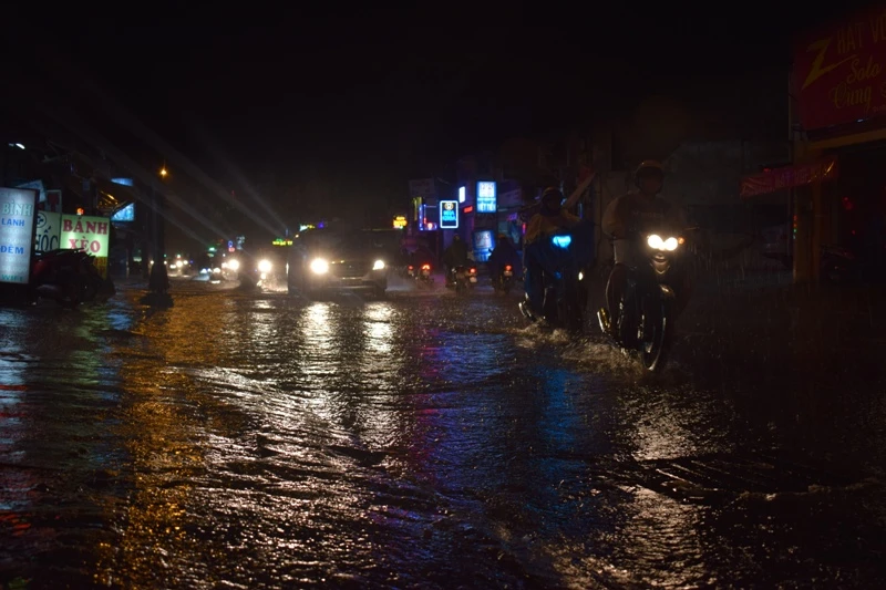 Ghi nhận tại đoạn đường này, cơn mưa nhỏ tối nay (10-6) cũng đủ khiến một đoạn đường dài ngập khá cao, nhiều xe máy chết máy giữa đường. Người dân bì bõm lội nước bẩn về nhà.