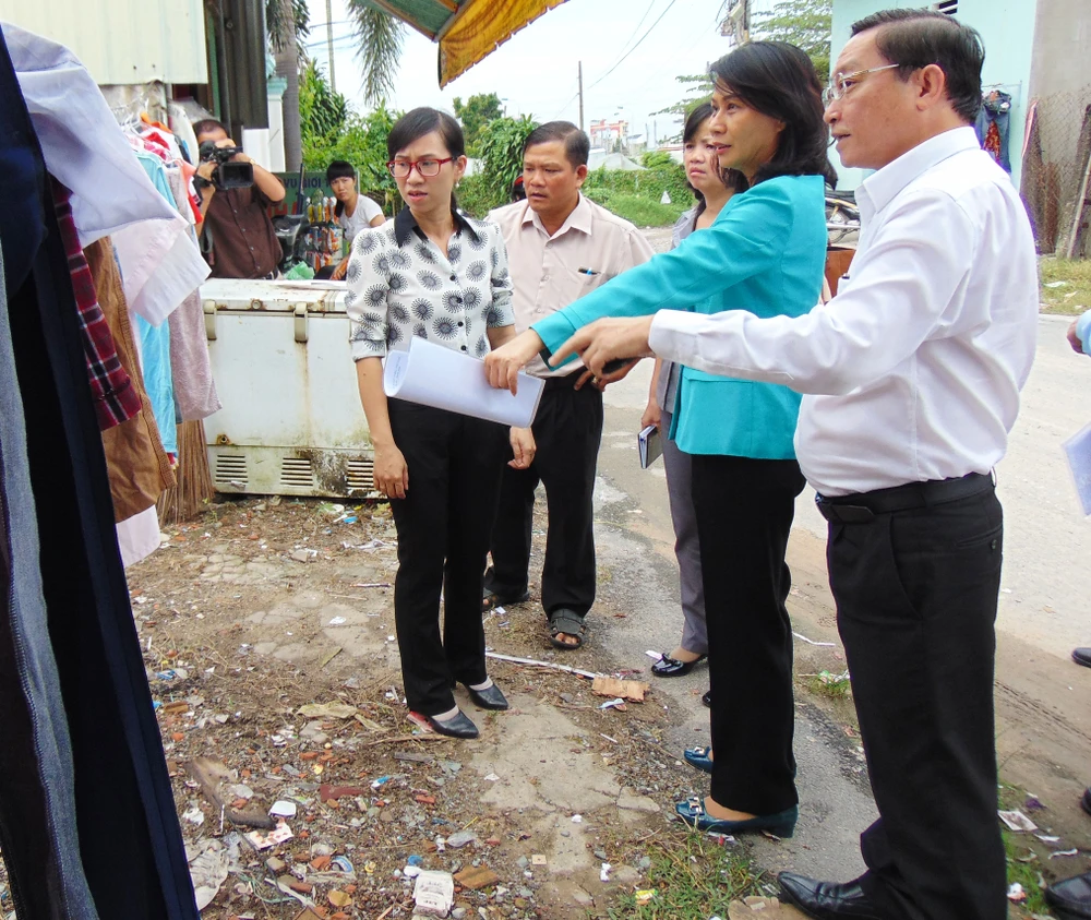 Phó Chủ tịch UBND TP.HCM Nguyễn Thị Thu (thứ hai từ phải sang) sang kiểm tra hoạt động phòng, chống Zika tại quận 12. Ảnh: TRẦN NGỌC
