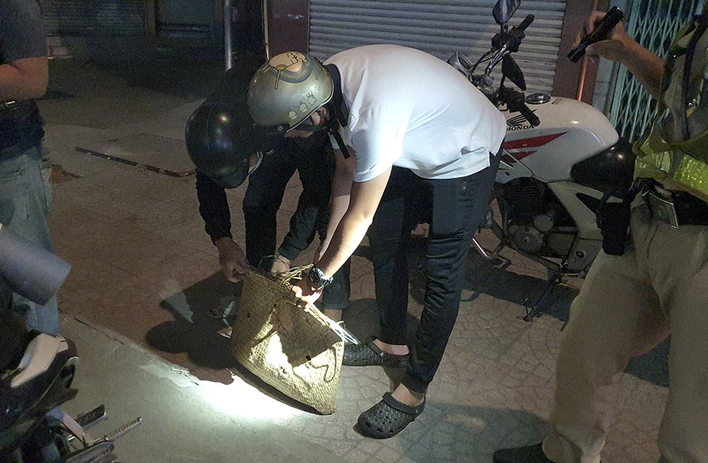 Tổ công tác kiểm tra tay nải của hai thanh niên, phát hiện bên trong đựng gà đá. Ảnh: NGUYỄN YÊN