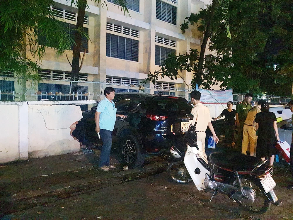 Tại hiện trường, một dải tường rào khoảng 2 mét vuông của trường học bị đâm sập. Riêng xe ô tô bị mắc kẹt và hư hỏng nhẹ phần đầu xe.